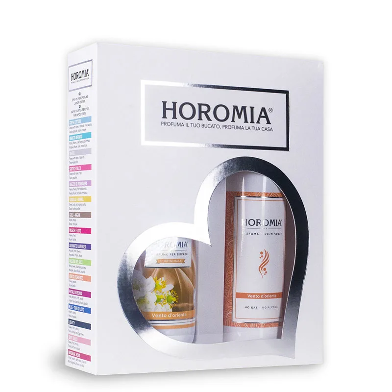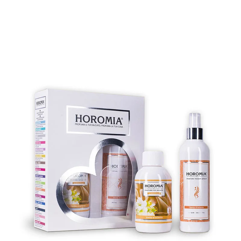 HOROTWINS je darilni paket, ki vsebuje parfum za perilo Horomia in parfum v razpršilu za tkanine iste dišave.
